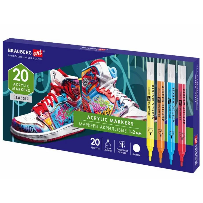 Маркеры акриловые для рисования и хобби, 20 ярких цветов, линия 1-2 мм, BRAUBERG ART CLASSIC, 152524