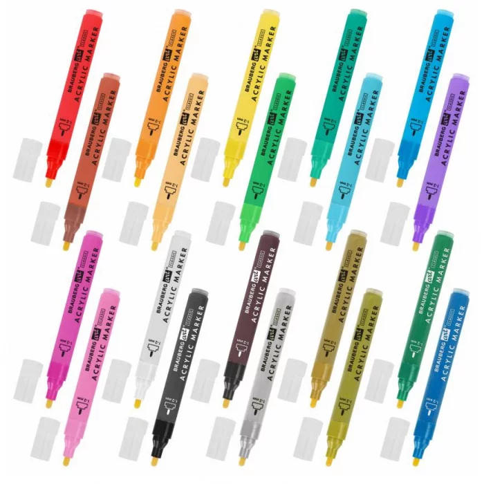 Набор акриловых маркеров BRAUBERG ART CLASSIC - это универсальный инструмент для письма, рисования и декорирования.Предназначены для использования на плотной бумаге, холсте, дереве, керамике, камне, стекле, коже. Набор акриловых маркеров с круглой формой корпуса из пластика. 20 ярких цветов. Толщина линии письма – 1 - 2 мм. Объём краски – 6 мл. Пигментированная акриловая краска на водной основе практически не имеет запаха, после высыхания обладает повышенной светостойкостью и водостойкостью. Краска обладает превосходной укрывистостью. Благодаря водной основе краска быстро сохнет и не размазывается. Надежный помповый механизм подачи краски предотвращает вытекание и разбрызгивание в процессе использования, а также преждевременное высыхание. Износостойкий фетровый наконечник устойчив к повреждениям и обеспечивает экономный расход чернил. Изделие не перезаправляется. Плотно закрывается колпачком, что предотвращает высыхание наконечника и чернил.