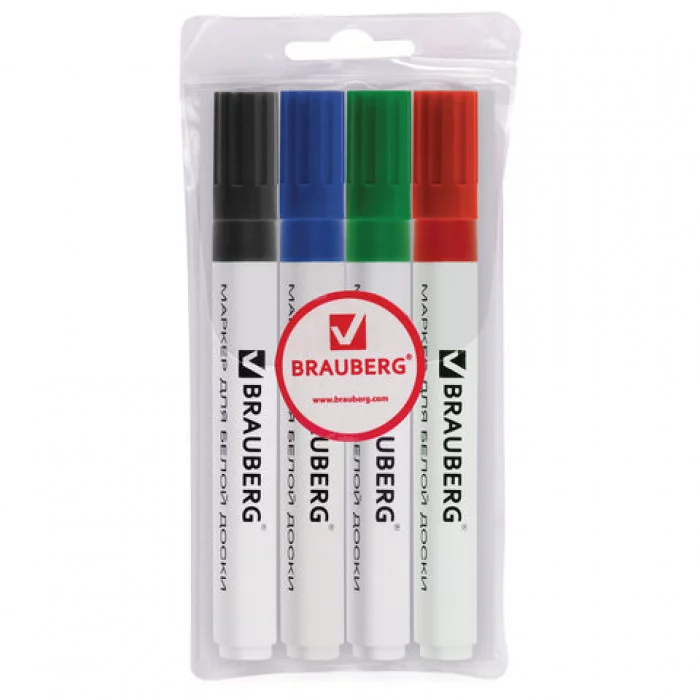 Высококачественный набор маркеров BRAUBERG для белой доски. Предназначен для письма на досках с магнитно-маркерной поверхностью. 4 цвета в наборе: черный, красный, синий, зеленый. Круглый корпус из пластика, диаметр которого 16 мм. Наконечник круглой формы обеспечивает толщину линии письма 5 мм, что позволяет писать крупным шрифтом, который будет хорошо виден. Основа чернил - водная. Чернила быстро высыхают и не оставляют разводов, легко стираются сухой губкой и не высыхают с открытым колпачком в течение нескольких дней. Изделие не перезаправляется. Цвет колпачка соответствует цвету чернил Цвет: ассорти. Серия: нет. Толщина линии письма: 5. Наконечник: круглый. Количество в комплекте: 4 шт.. Основа чернил: водная. Устойчив к засыханию: да. Чернила стираются сухой губкой: да. Материал корпуса: пластик Бренд - BRAUBERG. Производитель - Китай. Артикул - 150417. Штрихкод - 4606224028903