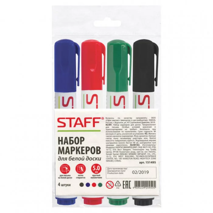 Маркеры для доски STAFF, НАБОР 4 шт., АССОРТИ (черный, синий, красный, зеленый), с клипом, круглые, 5 мм, 151495
