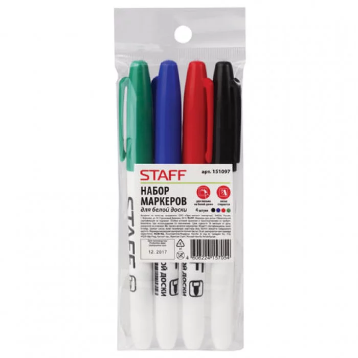 Набор маркеров STAFF для белой доски. Предназначен для письма на досках с магнитно-маркерной поверхностью. 4 цвета в наборе: черный, красный, синий, зеленый. Круглый пластиковый корпус имеет диаметр 17 мм. Наконечник круглой формы обеспечивает толщину линии письма 2-5 мм в зависимости от угла наклона, что позволяет писать как мелким, так и крупным шрифтом. Благодаря спиртовой основе чернила быстро высыхают и не оставляют разводов, легко стираются сухой губкой. Изделие не перезаправляется. Цвет колпачка соответствует цвету чернил.Это товар эконом-сегмента, поэтому он отличается привлекательной ценой. Товар обладает базовым набором характеристик и простой упаковкой, при этом полностью соответствует основным требованиям потребителей. Цвет: ассорти. Серия: EVERYDAY. Толщина линии письма: 2, 2,5, 3, 3,5, 4. Наконечник: круглый. Количество в комплекте: 4 шт.. Основа чернил: спиртовая. Чернила стираются сухой губкой: да. Не протекает при перепаде давления: да. Наличие клипа на колпачке: да. Материал корпуса: пластик
