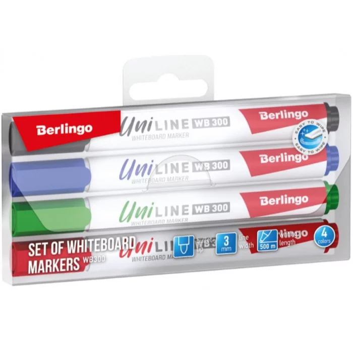 Набор маркеров для белых досок Berlingo "Uniline WB300" 04цв., пулевидный, 3мм, PET 319376