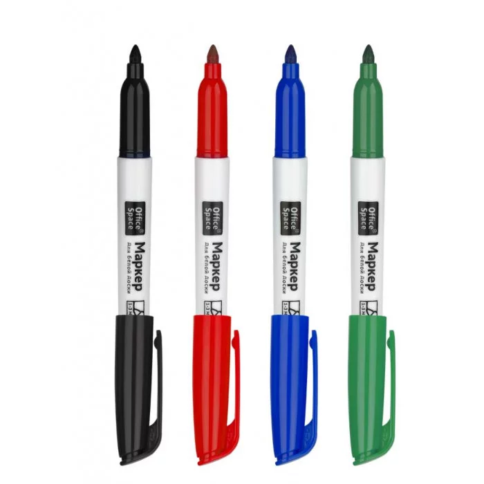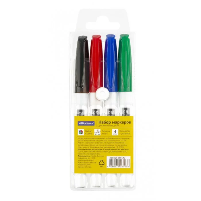 Набор маркеров OfficeSpace предназначен для письма на магнитно-маркерных досках. Толщина линии: 1-3 мм. Набор упакован в ПВХ чехол с европодвесом размерами 163*60*15 мм. Длина письма: 350 м. Закруглённый пишущий узел. В наборе 4 цвета: красный, синий, зеленый, чёрный. Чернила легко стираются сухой губкой для досок. Хранить с закрытым колпачком.