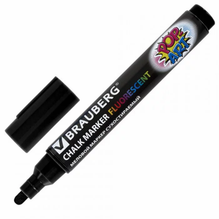 Стираемый меловой маркер BRAUBERG "POP-ART" - оригинальный инструмент для оформления различных зон помещений. Идеален для использования на школьных занятиях и детского творчества. СПОСОБ ПРИМЕНЕНИЯ:1. Перед использованием хорошо встряхнуть с закрытым колпачком.2. Снять колпачок, надавить на наконечник, дождаться, когда чернила полностью пропитают его.3. После использования плотно закрыть колпачок.Предназначен для росписи, создания рисунков и надписей на зеркалах, стекле, меловой пленке и прочих гладких и прозрачных невпитывающих поверхностях. Рисунок получается плотный и яркий. Чернила на водно-меловой основе черного цвета без резкого запаха. Толщина линии письма - от 1 мм до 5 мм, зависит от угла наклона мелового маркера. Круглый корпус выполнен из пластика.Обладает следующими преимуществами:- чернила светятся в УФ-свете;- повышенная светостойкость;- пулевидный наконечник устойчив к повреждению и истиранию. Цвет чернил: черный. Серия: POP-ART 5 мм. Количество в комплекте: 1 шт.. Форма наконечника: пулевидный