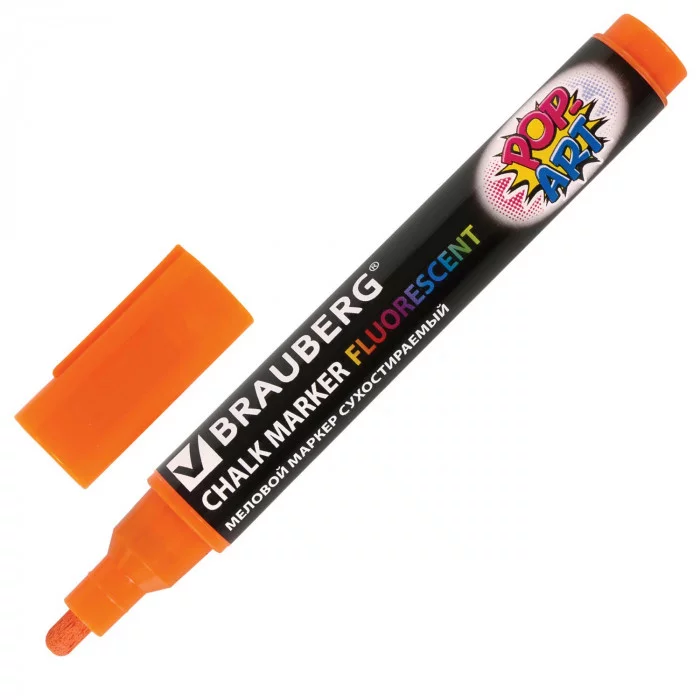 Стираемый меловой маркер BRAUBERG "POP-ART" - оригинальный инструмент для оформления различных зон помещений. Идеален для использования на школьных занятиях и детского творчества. СПОСОБ ПРИМЕНЕНИЯ:1. Перед использованием хорошо встряхнуть с закрытым колпачком.2. Снять колпачок, надавить на наконечник, дождаться, когда чернила полностью пропитают его.3. После использования плотно закрыть колпачок.Предназначен для росписи, создания рисунков и надписей на зеркалах, стекле, меловой пленке и прочих гладких и прозрачных невпитывающих поверхностях. Рисунок получается плотный и яркий. Чернила на водно-меловой основе оранжевого цвета без резкого запаха. Толщина линии письма - от 1 мм до 5 мм, зависит от угла наклона мелового маркера. Круглый корпус выполнен из пластика.Обладает следующими преимуществами:- чернила светятся в УФ-свете;- повышенная светостойкость;- пулевидный наконечник устойчив к повреждению и истиранию. Цвет чернил: оранжевый. Серия: POP-ART 5 мм. Количество в комплекте: 1 шт.. Форма наконечника: пуле