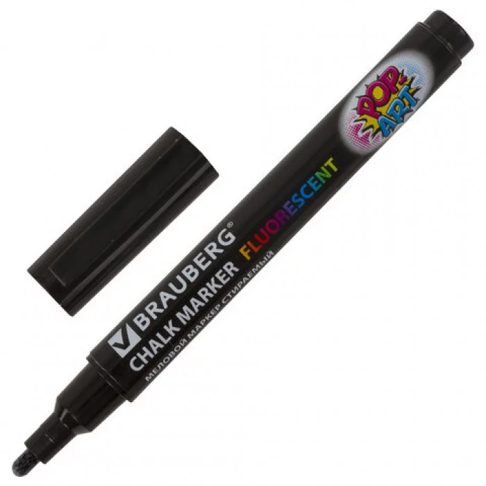 Сухостираемый меловой маркер BRAUBERG "POP-ART" - оригинальный инструмент для оформления различных зон помещений. Идеален для использования на школьных занятиях и детского творчества. СПОСОБ ПРИМЕНЕНИЯ:1. Перед использованием хорошо встряхнуть с закрытым колпачком.2. Снять колпачок, надавить на наконечник, дождаться, когда чернила полностью пропитают его.3. После использования плотно закрыть колпачок.Предназначен для росписи, создания рисунков и надписей на зеркалах, стекле, меловой пленке и прочих гладких и прозрачных невпитывающих поверхностях. Рисунок получается плотный и яркий. Чернила на водно-меловой основе черного цвета без резкого запаха. Толщина линии письма - от 1 мм до 3,5 мм, зависит от угла наклона мелового маркера. Круглый корпус выполнен из пластика.Обладает следующими преимуществами:- чернила светятся в УФ-свете;- повышенная светостойкость;- пулевидный наконечник устойчив к повреждению и истиранию. Цвет чернил: черный. Серия: POP-ART 3,5 мм. Количество в комплекте: 1 шт.. Форма наконечника: пу