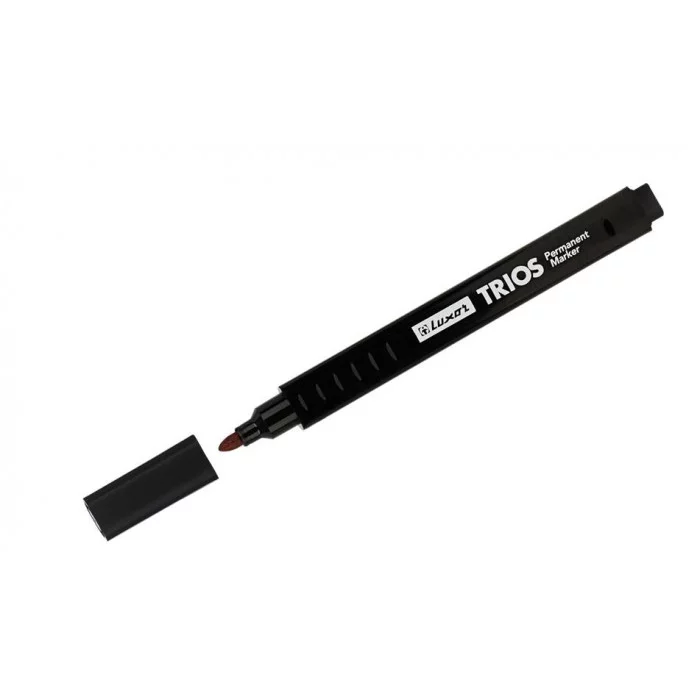 Эргономичный перманентный маркер Luxor "Trios" - универсальное решение для маркировки на всех типах поверхностей: металл, дерево, резина, бетон, камень, кирпич, стекло, пленка, картон. Трехгранный корпус перманентного маркера комфортно лежит в руке, рука не устает при длительном письме маркером. Корпус маркера изготовлен из прочного пластика. Плотный колпачок с клипом надежно предотвращает высыхание. Чернила на спиртовой основе. Чернила устойчивы к климатическим изменениям: дождь, туман, солнце, не стираются и не выцветают в течение длительного времени (до 3-х лет в зависимости от эксплуатации промаркированного изделия), оставляют четкую и однородную линию, безопасны для использования и не содержат ксилол и толуол. Длина непрерывной линии 700 метров. Цвет чернил - черный, диаметр пишущего узла от - 2,5 мм.
