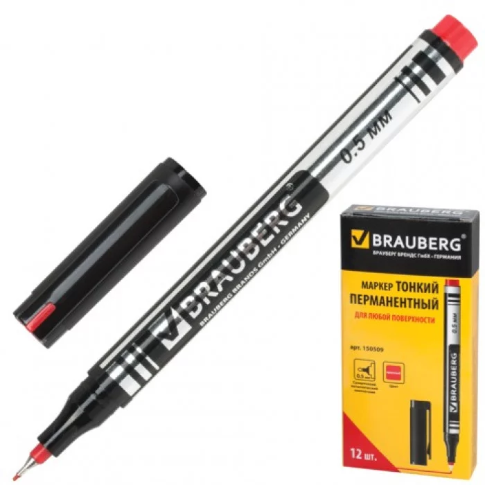 Маркер перманентный (нестираемый) BRAUBERG "Jet", супертонкий метал. наконеч. 0,5мм, красный, 150509
