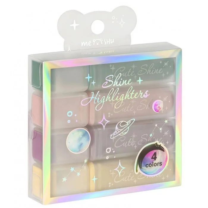 Набор текстовыделителей Shiny от бренда MESHU понравится тем, кто любит сиять и выделяться. Пастельные чернила с блёстками помогут ненавязчиво выделить главное в тексте и добавить конспектам гламурной эстетики. Готовый набор в милой упаковке станет отличной идеей для подарка. Чернила на водной основе не покрывают поверхность бумаги плотным слоем, но в то же время хорошо выделяют значимые фрагменты текста. Матовый корпус приятно держать. Благодаря прямоугольной форме текстовыделители не скатываются со стола. Они легко помещаются в пенале. Скошенный наконечник позволяет регулировать толщину линии письма от 1 до 5 мм, поэтому текстовыделители подходят для выделения большинства шрифтов. Можно подчёркивать записи тонкой линией или закрашивать всю строку одним движением. Текстовыделители упакованы в ПВХ-бокс с европодвесом. Толщина линий: 1-5 мм; Цвет чернил: ассорти (4 пастельных оттенка с глиттером); Упаковка: ПВХ-бокс с европодвесом; Количество штук в упаковке: 4.