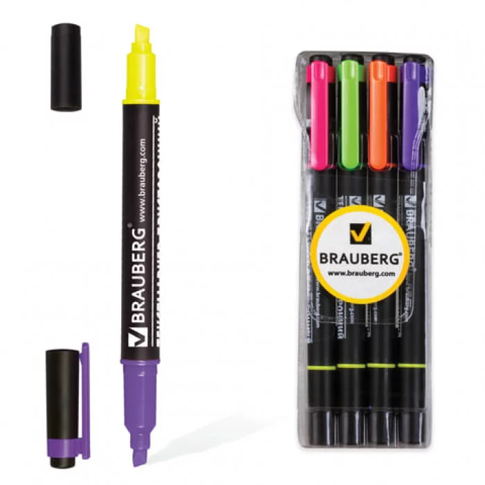 Текстмаркеры BRAUBERG двусторон, НАБОР 4 шт, скошен. нак. 1-4 мм, (лим-роз, зел, оранж, фиол), 150845