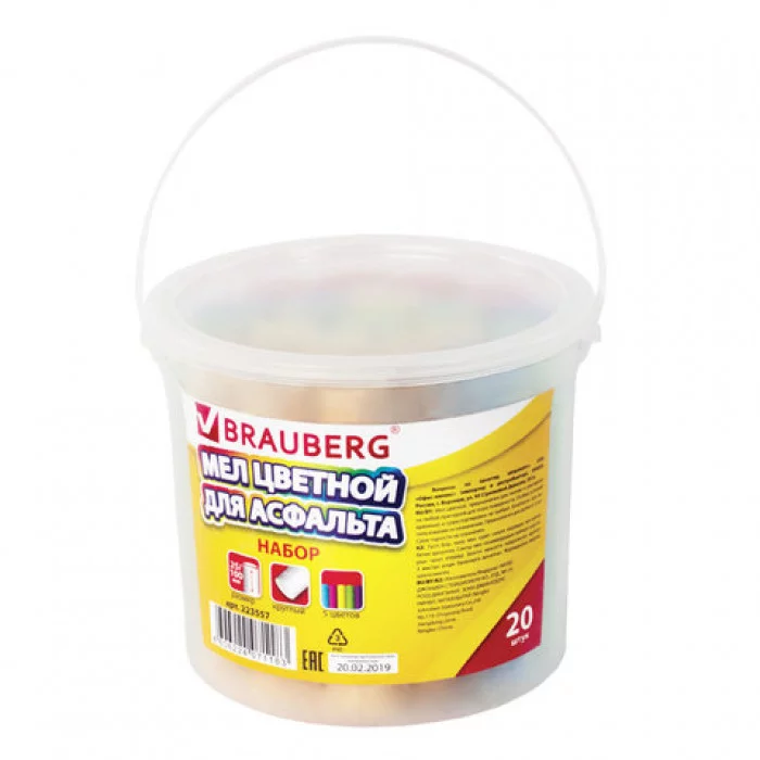 Цветной мел BRAUBERG предназначен для письма и рисования на асфальте. Изготовлен из высококачественного природного сырья, нетоксичен. Благодаря круглой утолщенной форме удобно ложится в руку. Легко смывается водой. Длина - 100 мм, диаметр - 25 мм. В наборе 20 цветных мелков (красный - 4 шт., оранжевый - 4 шт., желтый - 4 шт., зеленый - 4 шт., голубой - 4 шт.). Набор упакован в пластиковое ведро с ручкой. Цвет: ассорти. Назначение: для асфальта. Количество в упаковке: 20 шт.. Количество цветов: 5. Форма корпуса: круглая. Серия: Chalk. Длина: 100 мм. Диаметр: 25 мм. Твердость: средней твердости. Упаковка: пластиковое ведро Бренд - BRAUBERG. Производитель - Китай. Артикул - 223557. Штрихкод - 4606224071183