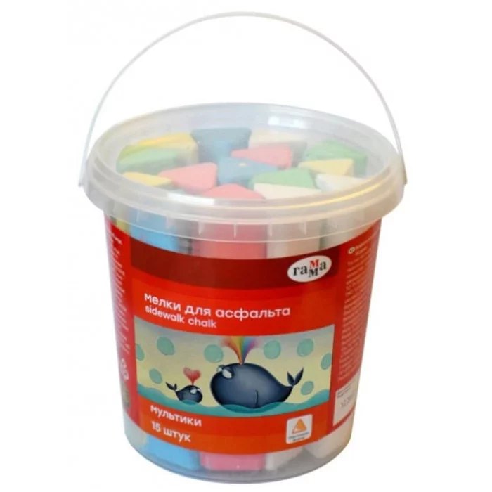 Набор треугольных мелков для рисования на асфальте ГАММА серии «Мультики» подходит для рисования на любой шероховатой поверхности и состоит из 15 мелков в 5 цветах: белый, желтый, зеленый, синий, красный. Длина – 10,5 см, высота – 22 мм. Удобная форма и мягкое письмо. Натуральный состав на основе мела, гипса, воды и пигментов, без выраженного запаха, средняя твердость. Следы мелков легко счищаются с рук. Набор упакован в пластиковое ведро. Большие наборы мелков оптимальны для творческого отдыха всей семьей или групповых занятий. Воспитатели и педагоги используют цветные мелки для рисования и подвижных игр на улице. НЕ РЕКОМЕНДОВАНО ДЛЯ ПИТАНИЯ ГАММА — единственный производитель мелков такого размера в России; Длина – 10 см, высота – 22 мм.