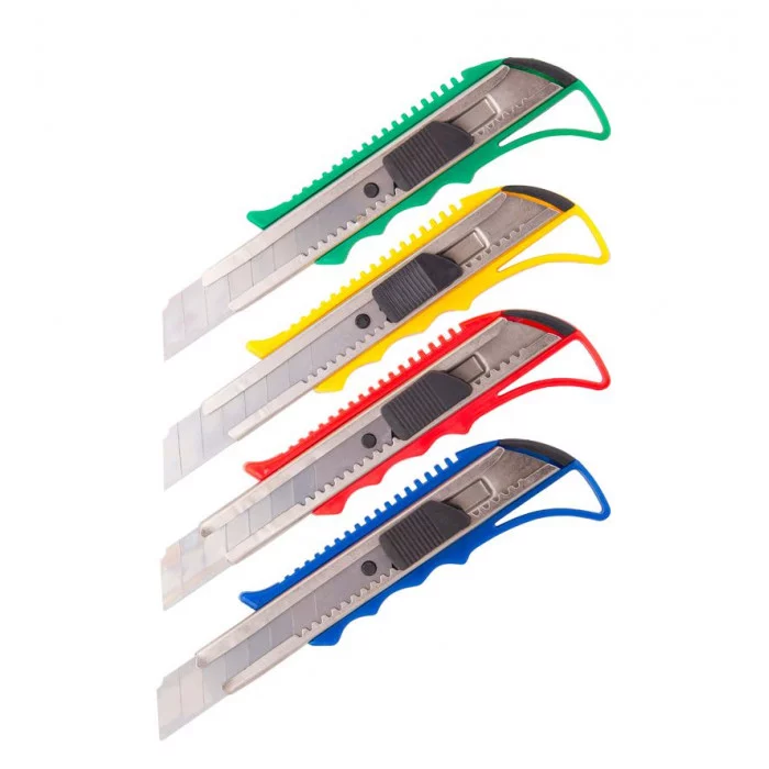 Нож канцелярский 18мм, усиленный, с фиксатором, металлические направляющие. Предназначен для резки различных материалов, в т.ч. особо плотных видов картона.