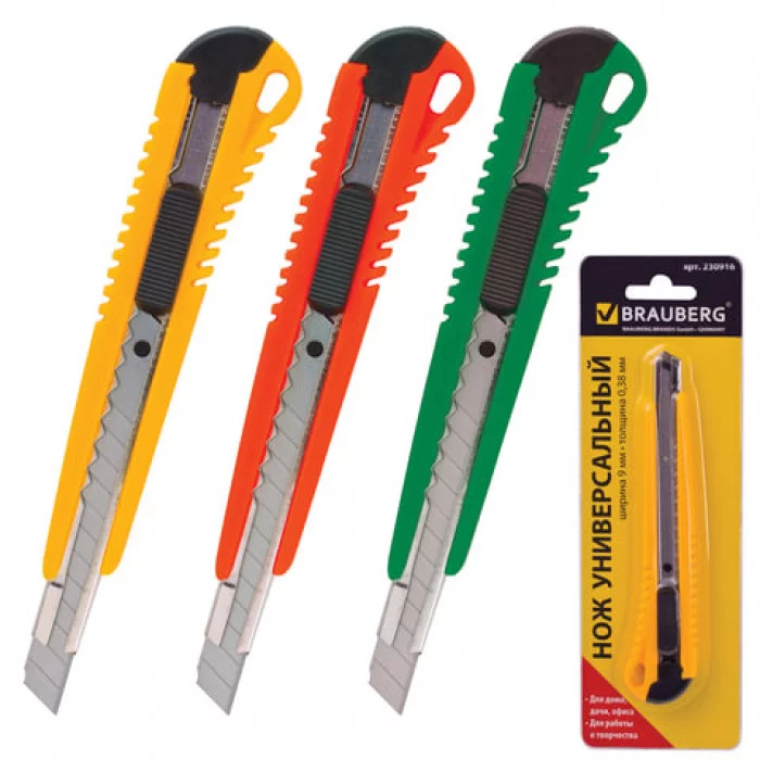 Нож канцелярский 9 мм BRAUBERG "Standard", автофиксатор, корпус ассорти, блистер, 230916