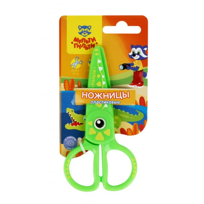 Ножницы детские пластиковые Мульти-Пульти "Приключения Енота, Крокодил" 12см, зеленый, трай-ми кард с европодвесом 348457