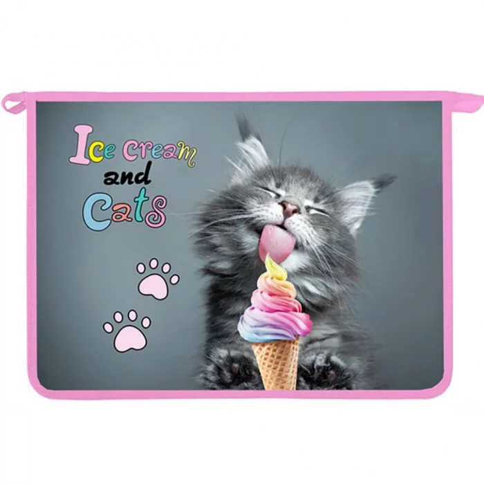 ПТ- 835 Котёнок с мороженкой -папка д/тетр. А4 на молнии, дизайн с двух сторон