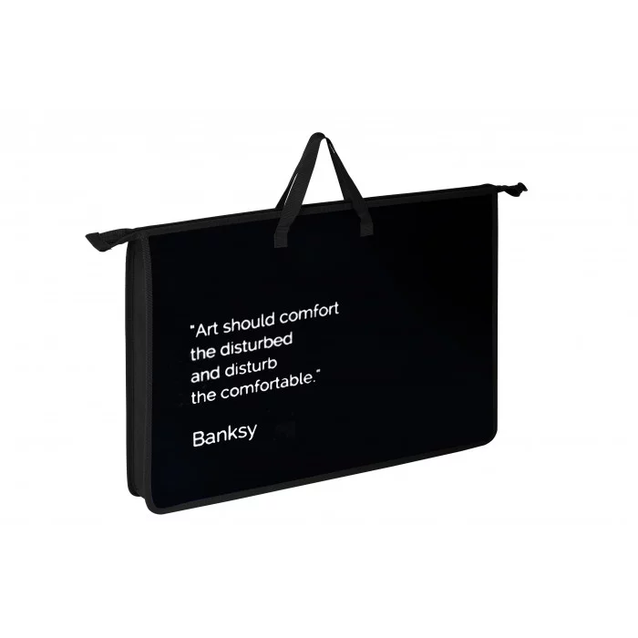 Конструкция состоит из 2-х листов плотного пластика, соединенных широкой полосой прочного полиэстера (5 см), что позволяет носить и отдельные листы бумаги/рисунки, защищая их от замятия, и заполнять папку различными объемными предметами – холсты на подрамниках, краски, баночки для воды и т.д. При этом папка обладает большой вместимостью, а также выдерживает значительный вес благодаря крепким, надежно закрепленным ручкам. Стильный трендовый дизайн апеллирует к творческой аудитории покупателей: художникам, учащимся художественных училищ и школ, креативной молодежи. Логотип марки аккуратно вынесен на вшивной ярлык.