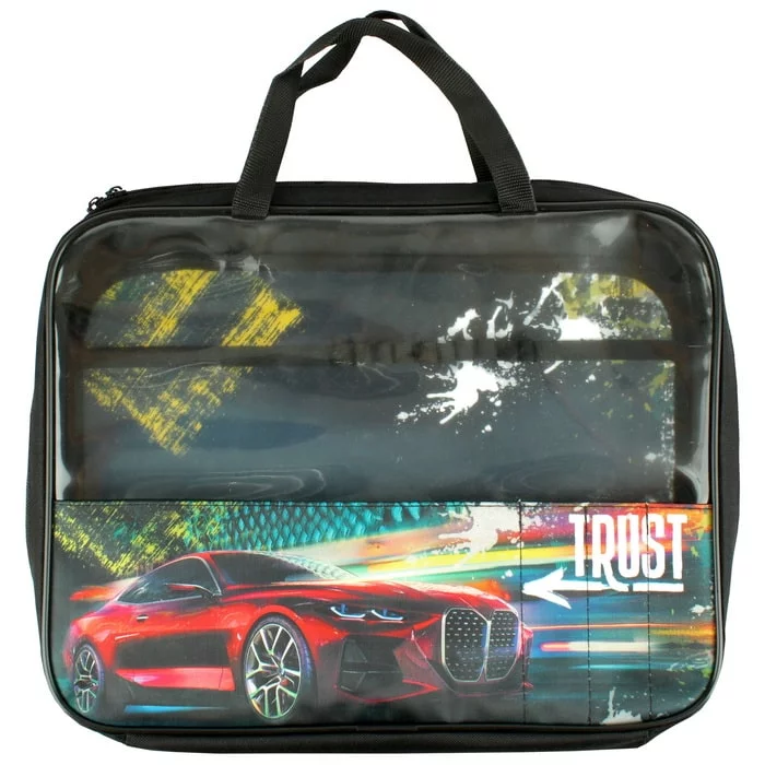 Папка для труда А4 с откидной планкой с резинками для канцелярских принадлежностей. Закрывается на молнию по кругу. Выполнена из водоотталкивающей ткани и мягкого пластика. Размер папки: 33,5х26 см. Ширина: 6 см.