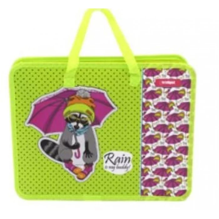 Папка для творчества А4 с ткан. ручками CQ-7611 "Енот под зонтиком" пластиковая, молния сверху, салатовая с рисунком (1/240) 323253