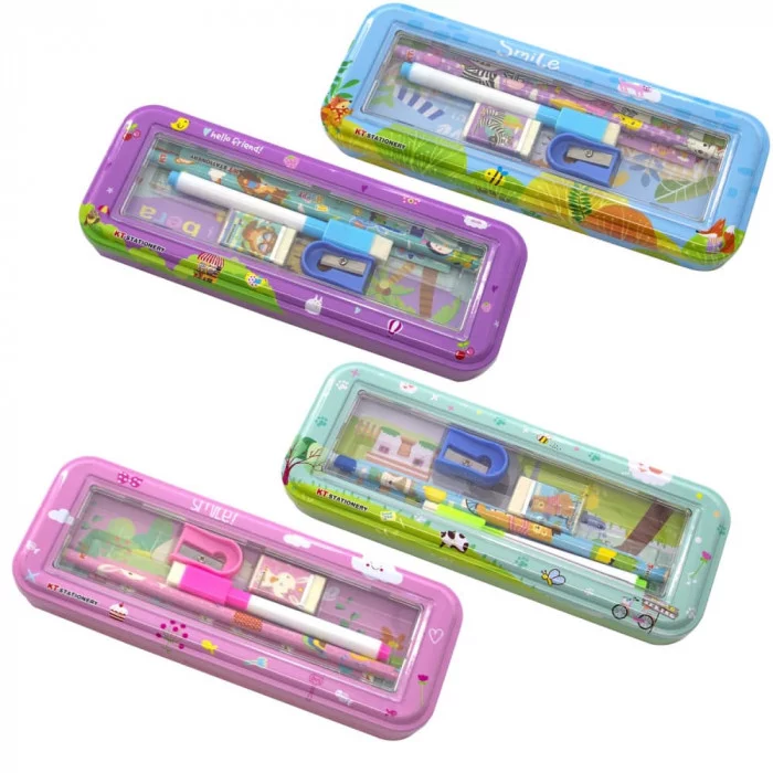 Пенал металлический 2 отделения Alingar, линейка 15 см, 1 ч/г каран, 1 точил, 1 ласт, 1 флом, 75 х 210 мм, ассорти