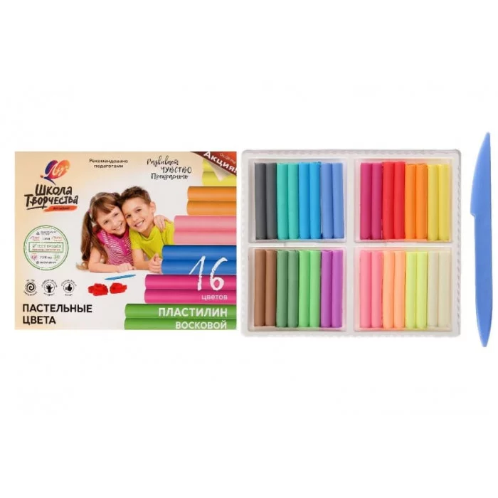 Пластилин восковой Луч ШКОЛА ТВОРЧЕСТВА 16 цв. пастель 240 г ассорти со стеком 205960