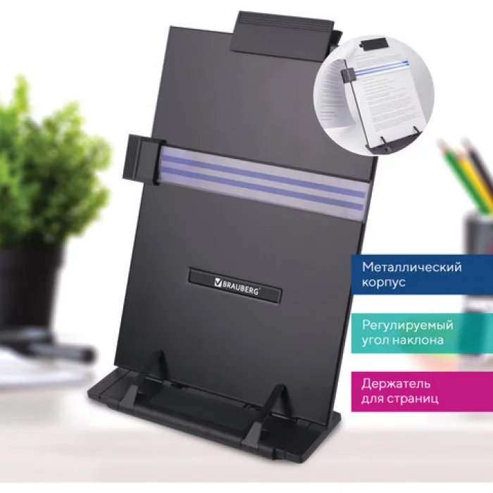 Подставка для книг, учебников BRAUBERG, большая, регулируемый наклон, металл/пластик, черная, 237447