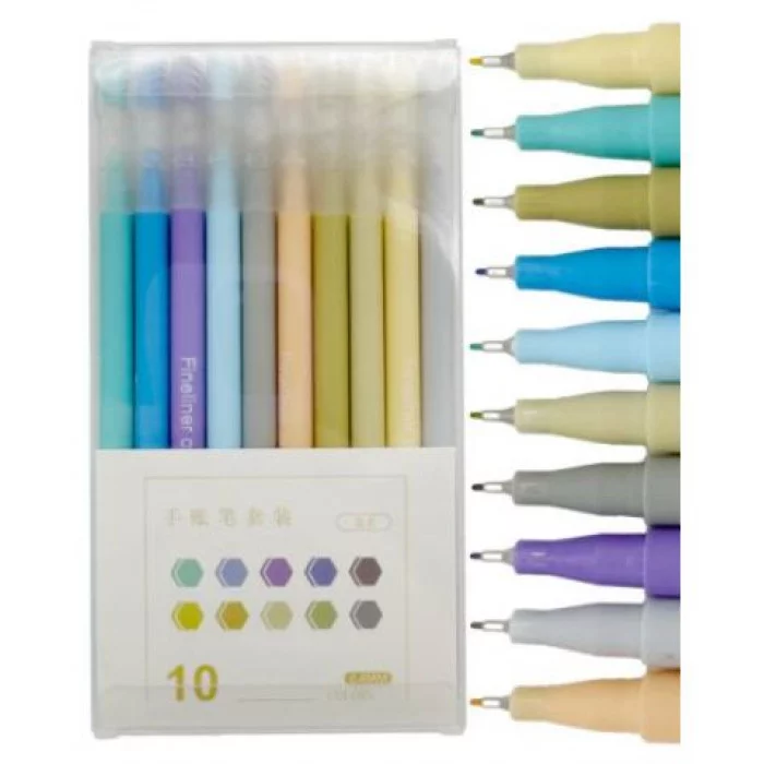 Набор ручек-линеров с чернилами разных цветов. Выполнены в круглом пластиковом корпусе. Цвет корпуса соответствует цвету чернил. Чернила на водной основе обеспечивают четкие, тонкие и яркие линии, при этом не просачиваясь через бумагу. Толщина линии - 0.4