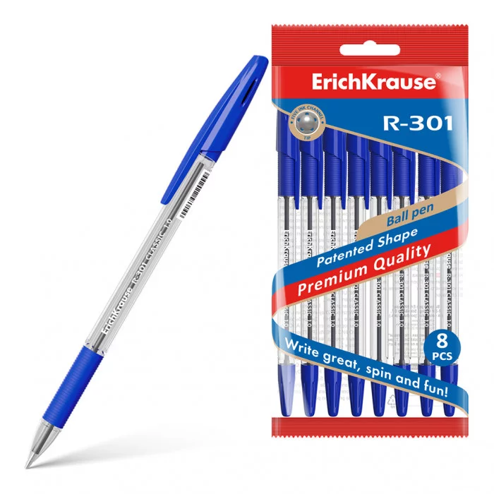 Классическая шариковая ручка Stick&Grip со стандартным типом пишущего узла и заменяемым стержнем. Ручка имеет прозрачный шестигранный корпус с удобной профилированной грип-зоной из резины и вентилируемый колпачок. Цвет колпачка, грип-зоны и заглушки соответствует цвету чернил. 5-канальный пишущий узел с диаметром шарика 1.0 мм в сочетании с быстросохнущими чернилами обеспечивает мягкое и комфортное письмо. Длина непрерывной линии составляет 2000 м при толщине 0.5 мм. Модель R-301 Classic 1.0 Stick&Grip имеет узнаваемую запатентованную форму и стала одним из бестселлеров в ассортименте шариковых ручек ErichKrause® более чем в пятидесяти странах мира.