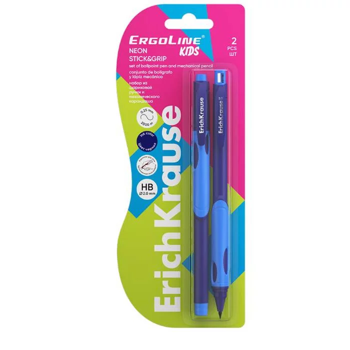 Набор из ручки шариковой Neon 0.5, Super Glide Technology, цвет чернил синий и карандаша мех 2.0, HB ErichKrause ErgoLine® Kids 63120