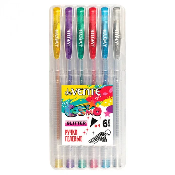 Набор ручек гелевых "deVENTE. Cosmo Glitter" 06 цветов с блестками, d=1 мм, прозрачный корпус с металлическим наконечником, сменный стержень, в пластиковой коробке с подвесом