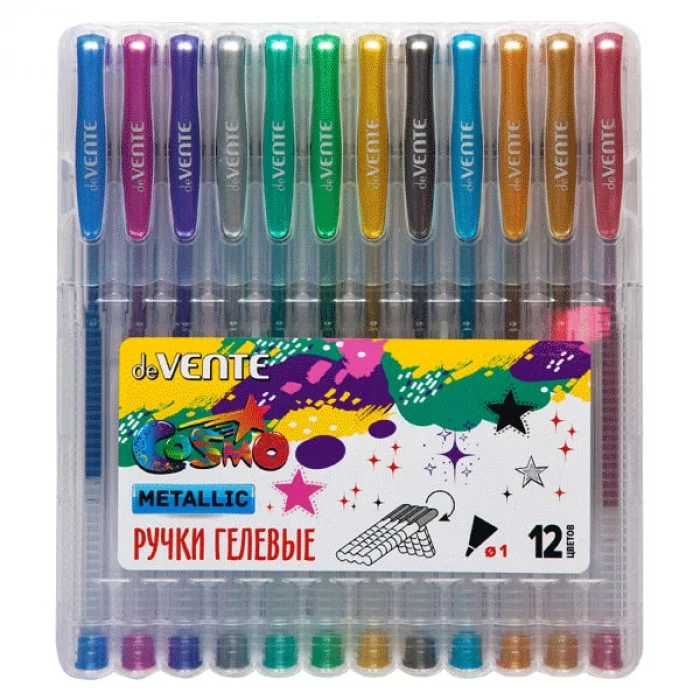 Набор ручек гелевых "deVENTE. Cosmo Metallic" 12 цветов металлик, d=1 мм, прозрачный корпус с металлическим наконечником, сменный стержень, в пластиковой коробке с подвесом