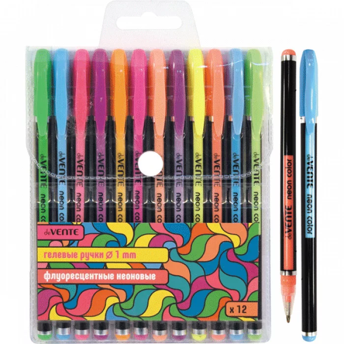 Набор ручек гелевых "deVENTE. Neon Black" 12 флуоресцентных неоновых цветов, d=1 мм, черный корпус с цветными полосами, сменный стержень, в пластиковом блистере