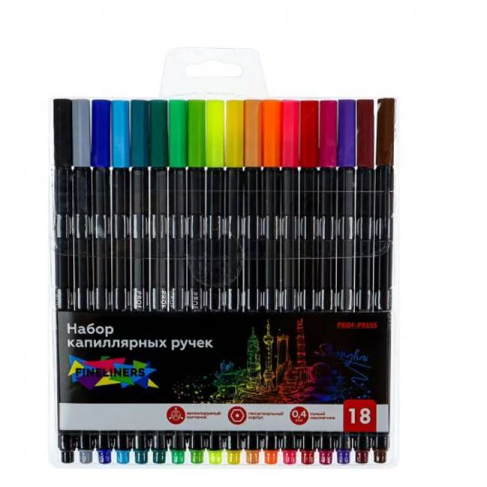 Набор ручек капиллярных 18 цв. SHANGHAI (НР-4744) гексагональный корпус, d=0,4 мм, НР-4744