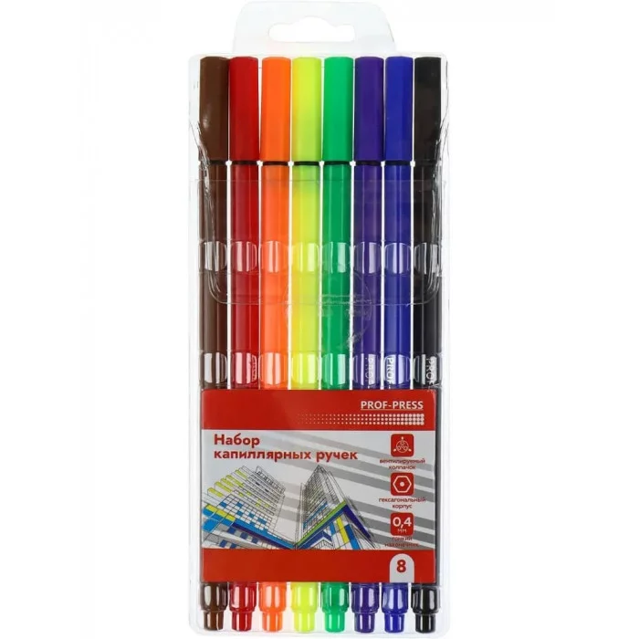 Для ультратонкого и мягкого письма идеально подойдут капиллярные ручки. С ними вы получите огромное удовольствие при создании чертежей или рисунков! Набор состоит из 8 цветов. Цвет корпуса соответствует цвету чернил. А, благодаря гексагональному корпусу, такие ручки еще и очень удобно держать в руках. Диаметр: 0,4 мм.