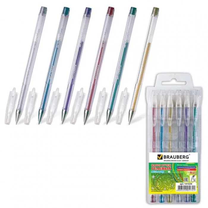 Ручки гелевые BRAUBERG, НАБОР 6шт, Jet, чернила металлик, узел 0,7мм, линия 0,5мм, ассорти, 141029