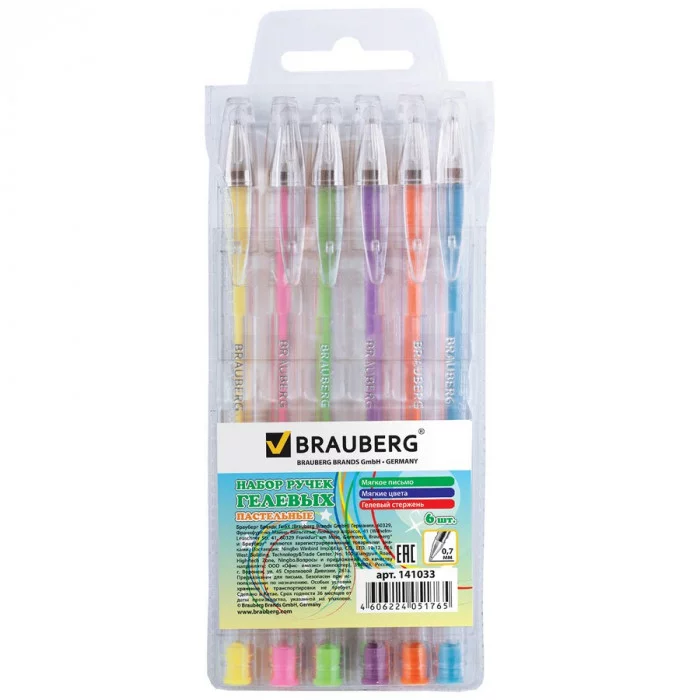 Ручки гелевые BRAUBERG, НАБОР 6шт, Jet, чернила пастельные, узел 0, 7мм, линия 0, 5мм, ассорти, 141033