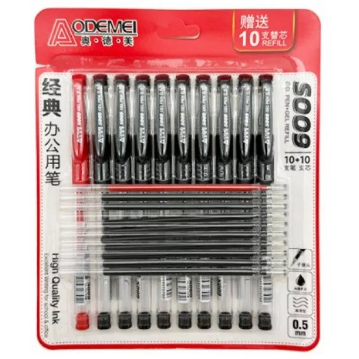Набор многоразовых гелевых ручек с дополнительно сменными стержнями. В наборе: 9 черных и красная ручки. Обеспечивает легкое и мягкое письмо, яркие и насыщенные линии. Чернила быстро высыхают, не размазываются.