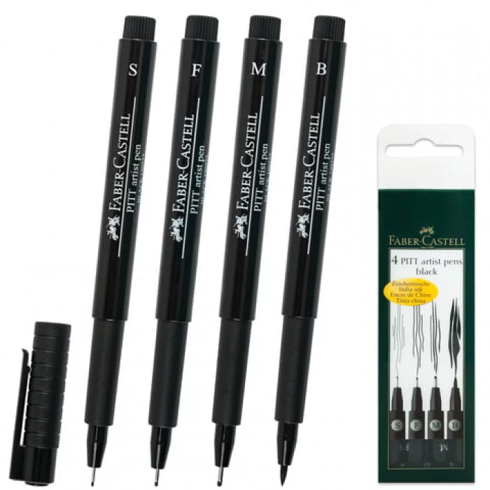 Набор капиллярных ручек (линеров) Faber-Castell Pitt Artist Pen от немецкого производителя Faber-Castell состоит из 4 ручек с различными пишущими узлами черного цвета: S = 0,3 мм, F = 0,5 мм, M = 0,7 мм и B=Brush. Ручки идеально подходят для письма, рисования, скетчинга, создания иллюстраций и черчения. Тушь всегда была интересным средством выражения для художников и графиков, она придает рисункам выразительность и долговечность, а также может сочетаться со многими другими техниками рисования. Faber-Castell объединил все преимущества Высокопигментированные и очень светостойкие чернила для рисования идеально подходят для разных изобразительных техник. Чернила без кислот, не имеют запаха, рН нейтральны, не оставляю следов на оборотной стороне бумаги. Удлиненный пишущий узел в металлической оболочке надежен и очень удобен при работе с линейками и трафаретами. Гибкий пишущий узел в виде кисти (Brush) сохраняет форму даже после длительного использования. Faber-Castell старается сделать свою продукцию максимально э