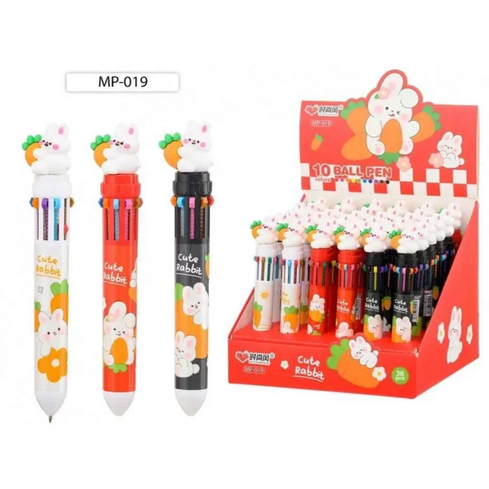 Авторучка 10-и цветная: детская; 1шт "ЗАЙЧИК"; цветной корпус с рисунком /ассорти/, прорезиненный наконе MP-019