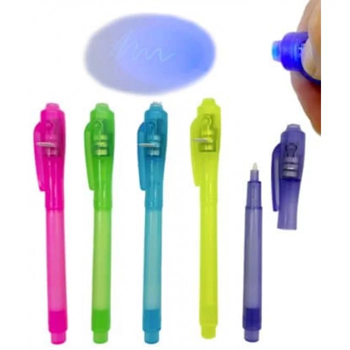 Ручка-шпион, которая пишет невидимыми чернилами. В комплекте - ультрафиолетовый фонарик встроенный в колпачок. Стоит его включить и направить на место секретной надписи, как все станет видно! УФ-фонарик работает от 3 батареек AG3 (в комплекте)
