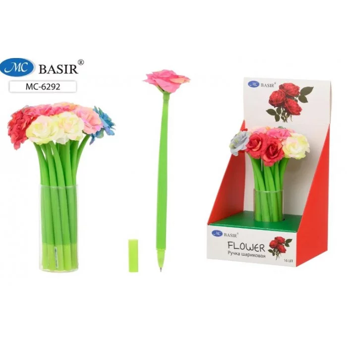 Шариковая ручка: "РОЗА"; прорезиненный корпус зелёного цвета, наконечник роза /цвета в ассортименте/, цвет чернил-синий.