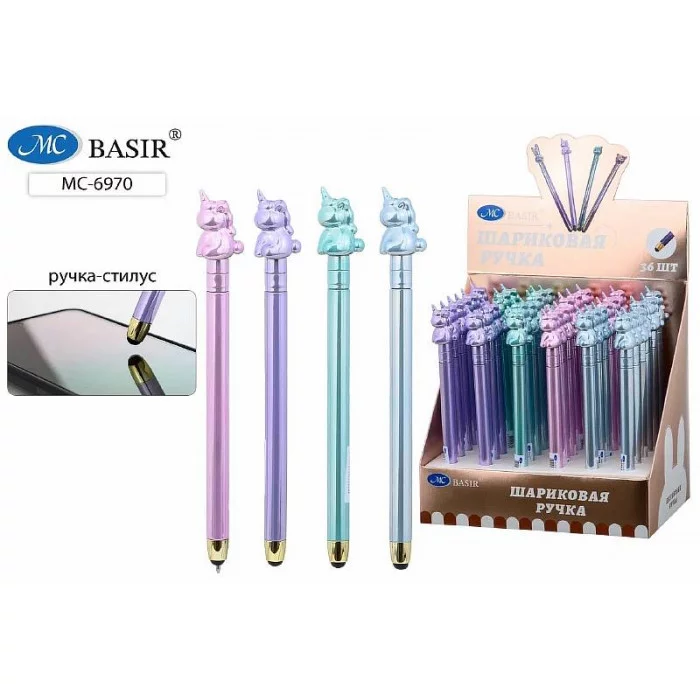 Шариковая ручка с поворотным механизмом+стилус: цветной-металлик корпус /ассорти/, наконечник-ЕДИНОРОГ; цвет чернил синий.