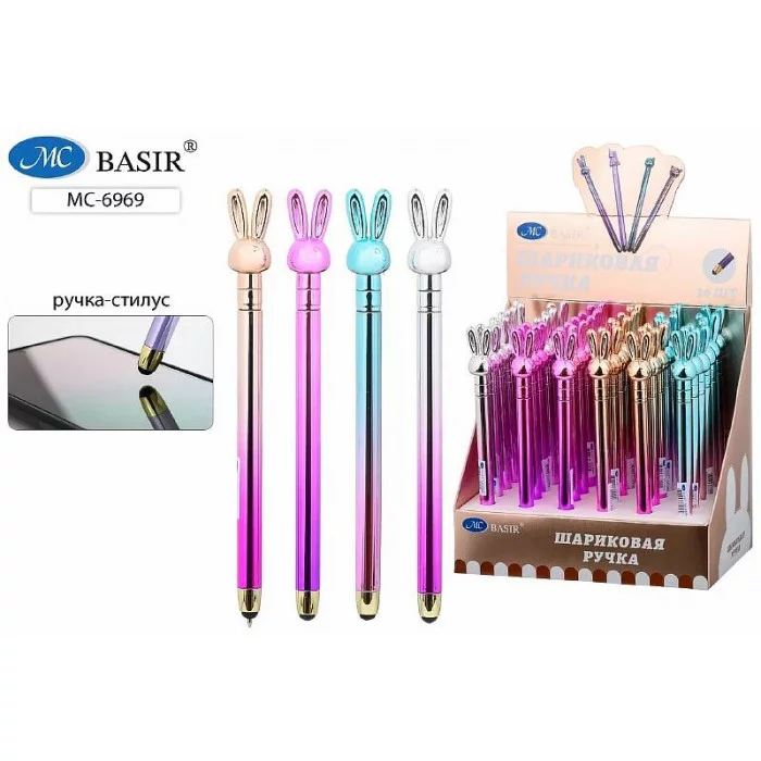 Шариковая ручка с поворотным механизмом+стилус: цветной-металлик корпус ассорти наконечник-ЗАЙЧИК МС-6969