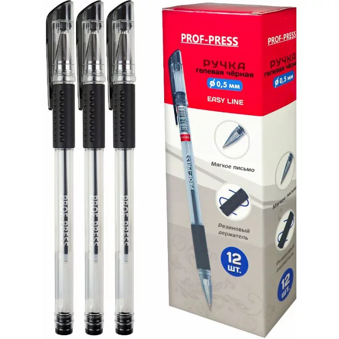 Гелевая ручка черного цвета с прозрачным корпусом. Ручка пишет легко и быстро, не требует нажима. Резиновая манжета предотвращает усталость кисти при долгом письме. Диаметр 0,5 мм.