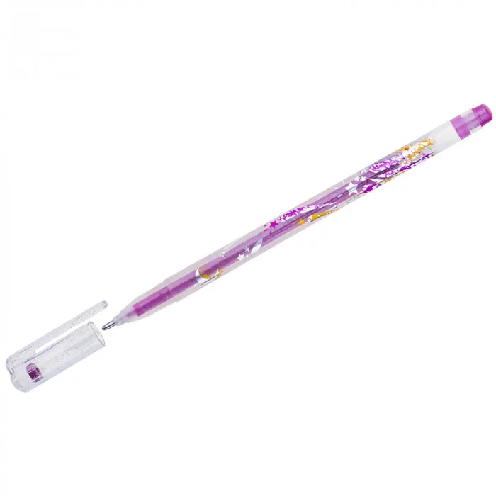 Одноразовая гелевая ручка с прозрачным пластиковым корпусом, современный дизайн которой дополнен блестками. Гелевые чернила обладают не только лаковым блеском металла, но и содержат мельчайшие частички фольги.