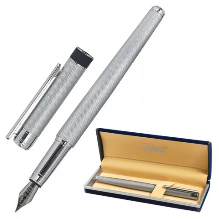 Картридж с чернилами находится внутри корпуса. Роскошная перьевая ручка GALANT "SPIGEL" станет отличным подарком к любому празднику или событию, подчеркнет статус и изысканность вкуса владельца. Картридж с чернилами находится внутри корпуса! Способ применения:1) Снимите с ручки колпачок, затем раскрутите ее корпус.2) Вставьте картридж узким концом в ту часть ручки, на которой закреплено перо.3) Надавите на картридж до щелчка, который возникает тогда, когда ниппель подачи чернил на перо протыкает картридж.4) Подержите ручку в вертикальном положении, чтобы под силой тяжести чернила стекли к перу. Этот процесс может занять некоторое время.5) Ручка готова к использованию.Элегантная модель перьевой ручки с корпусом из латуни серебристого цвета с декоративной гравировкой. Синий цвет чернил; иридиевое перо украшено гравировкой. Диаметр пишущего узла – 0,8 мм. Тип пера M (Medium) – средняя ширина линии. Поставляется в индивидуальном подарочном футляре. Подходит для гравировки. Серия: SPIGEL. Цвет корпуса: серебристый