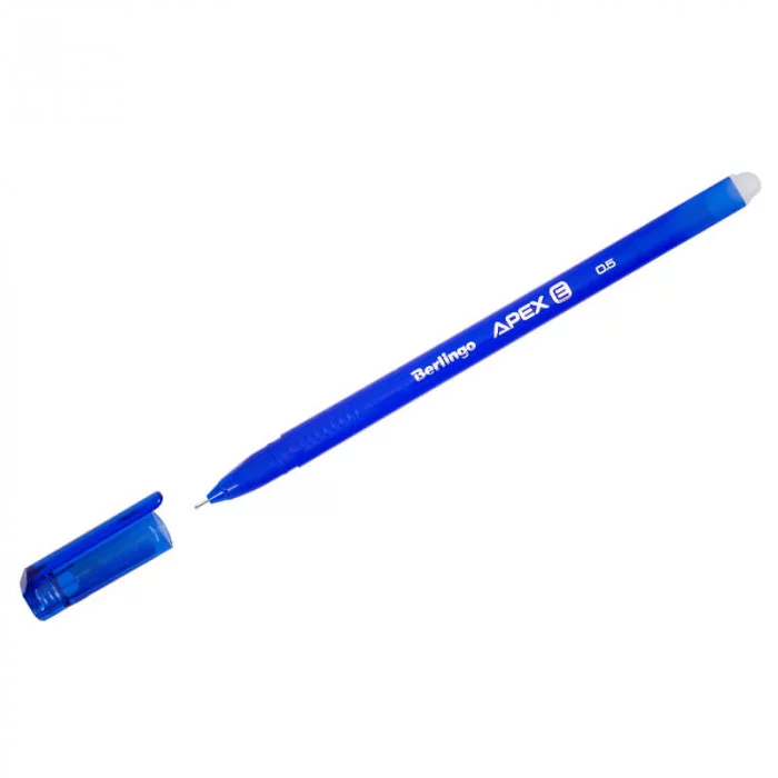 Одноразовая стираемая гелевая ручка Berlingo Apex E с колпачком с пластиковым клипом. Удобная трёхгранная форма. Рифление в зоне захвата препятствует скольжению пальцев при письме. Тонированный корпус позволяет контролировать расход чернил. Цвет корпуса соответствует цвету чернил. Качественные гелевые чернила обеспечивают чистое и чёткое письмо. Диаметр пишущего узла - 0,5 мм. Термочувствительные чернила становятся невидимыми при нагревании до 60°С и выше. Нагрев достигается трением встроенным в торцевой элемент ластиком. Обесцвеченные чернила проявляются при температуре ниже -18°С . Возможность многократного стирания и написания текста. Количество циклов написания/стирания ограничено износостойкостью бумаги. Диаметр пишущего узла составляет 0,5 мм, благодаря чему получается тонкая, аккуратная линия. Толщина линии письма составляет 0,3 мм, длина непрерывной линии - свыше 350 метров. Цвет чернил: синий; Толщина линии письма: 0,3 мм; Длина линии письма: 350 м; Цвет корпуса: тонированный синий.