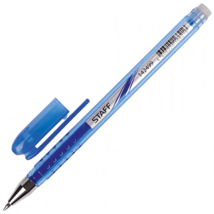 Стираемая ручка STAFF пишет специальными гелевыми чернилами, которые становятся невидимыми при нагревании до 60 °С и выше. Нагрев достигается ластиком, встроенным в корпус ручки. Написанное можно восстановить при температуре ниже –18 °С. Имеется возможность многократного стирания. Ручка имеет круглый корпус и стандартный наконечник, а также рифленую зону захвата, которая препятствует скольжению пальцев при письме. Длина сменного стержня составляет 130 мм. Диаметр пишущего узла, равный 0,5 мм, создает линию письма, равную 0,38 мм. Цвет чернил - синий.