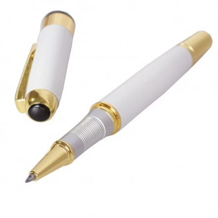 Подарочная ручка Alingar изготовлена из высококачественных материалов, отличается наибольшей долговечностью. Утолщённый металлический корпус круглого сечения, белого цвета, выглядит презентабельно. Дополнительные вставки, декоративные элементы, детали корпуса и колпачка выделены золочением. На защитном колпачке имеется упругий прямой клип для фиксации пишу