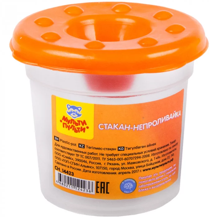 Идеален для использования при рисовании красками. Объем стакана оптимально подобран для обхвата детской рукой. Специальная форма стакана с плотно закрывающейся крышкой исключает возможность вытекания воды. Материал - полупрозрачный пластик, крышка оранжевого цвета.